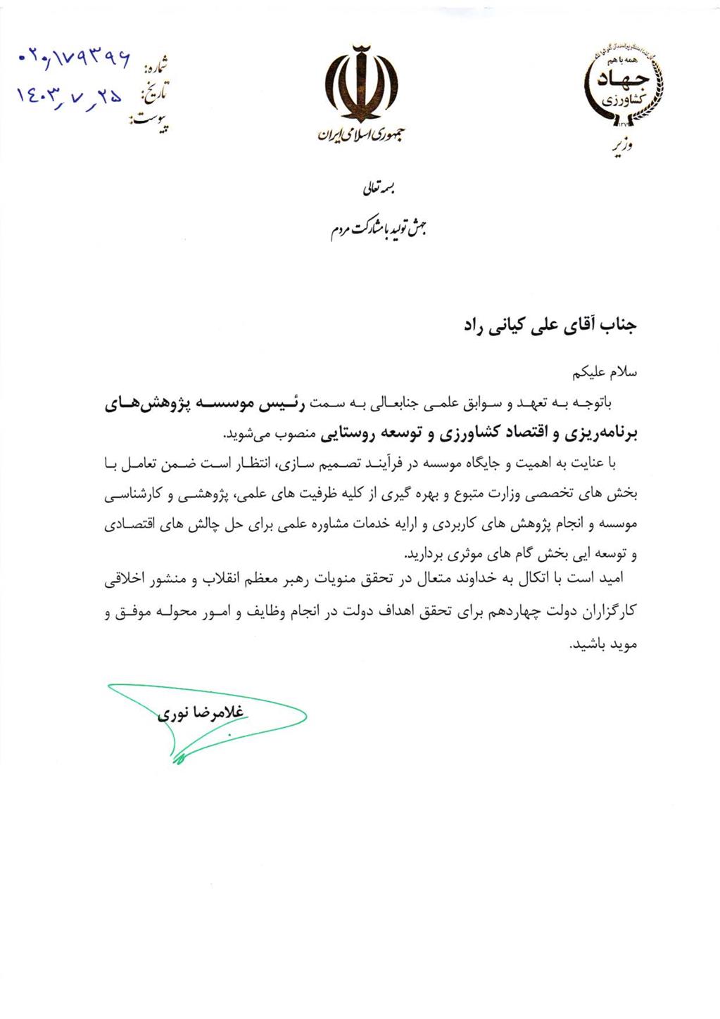 وزیر جهاد کشاورزی، در حکمی «علی کیانی‌راد» را به سمت رئیس موسسه پژوهش‌های برنامه‌ریزی، اقتصاد کشاورزی و توسعه روستایی منصوب کرد.