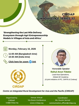 موسسه پژوهش‌های برنامه‌ریزی، اقتصادکشاورزی و توسعه روستایی، موسسه پژوهشی رابط با مرکز توسعه روستایی یکپارچه برای آسیا و اقیانوسیه CIRDAP، دعوت به وبینار مجازی با موضوع «تقویت اکوسیستم تحویل محصول در آخرین حلقه زنجیره تامین از طریق الگوهای کارآفرینی کشاورزی در روستاهای آسیا و آفریقا» می‌نماید.