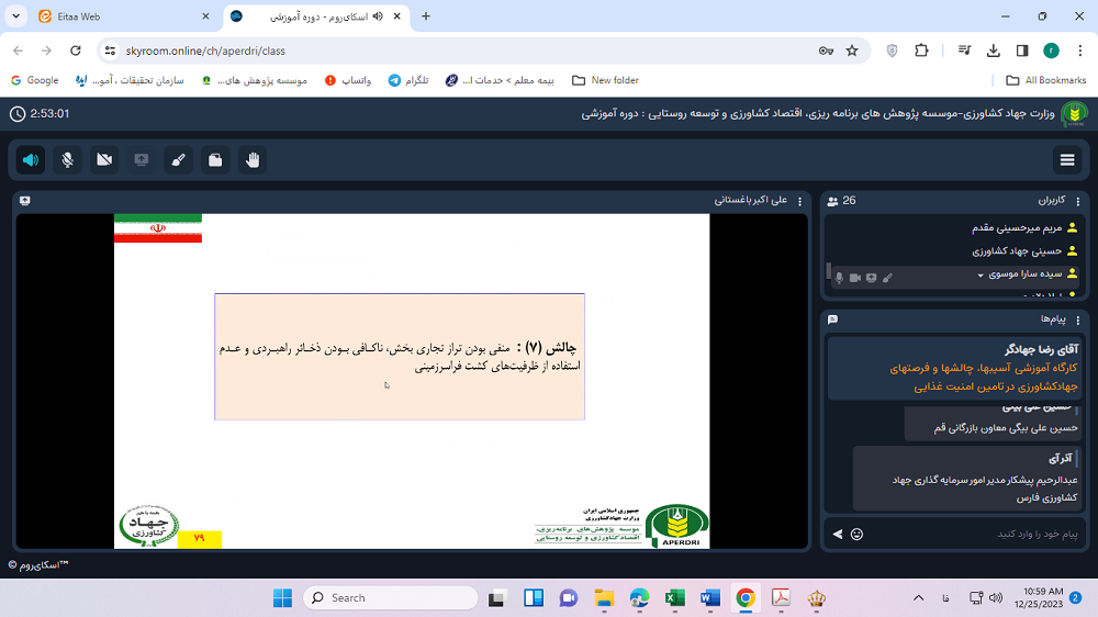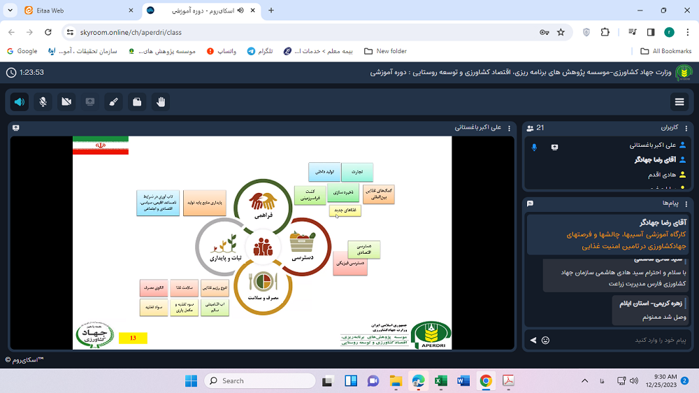 کارگاه آموزشی با عنوان «آسیبها، چالشها و فرصتهای جهاد کشاورزی در تامین امنیت غذایی» با ارائه‌ی جناب آقای دکتر علی اکبر باغستانی، عضو هیات علمی و مدیر محترم گروه پژوهشی برنامه ریزی راهبردی کشاورزی و امنیت غذایی موسسه پژوهش‏های برنامه‏ریزی، اقتصادکشاورزی و توسعه‌ روستایی در روزهای دوشنبه 04 و 11 دی ماه 1402، از ساعت 09 الی 11:30 و با حضور کارشناسان و مدیران مرتبط سازمان‌های جهاد کشاورزی استان‌ها به صورت ویدئو کنفرانس توسط واحد آموزش موسسه برگزار شد.