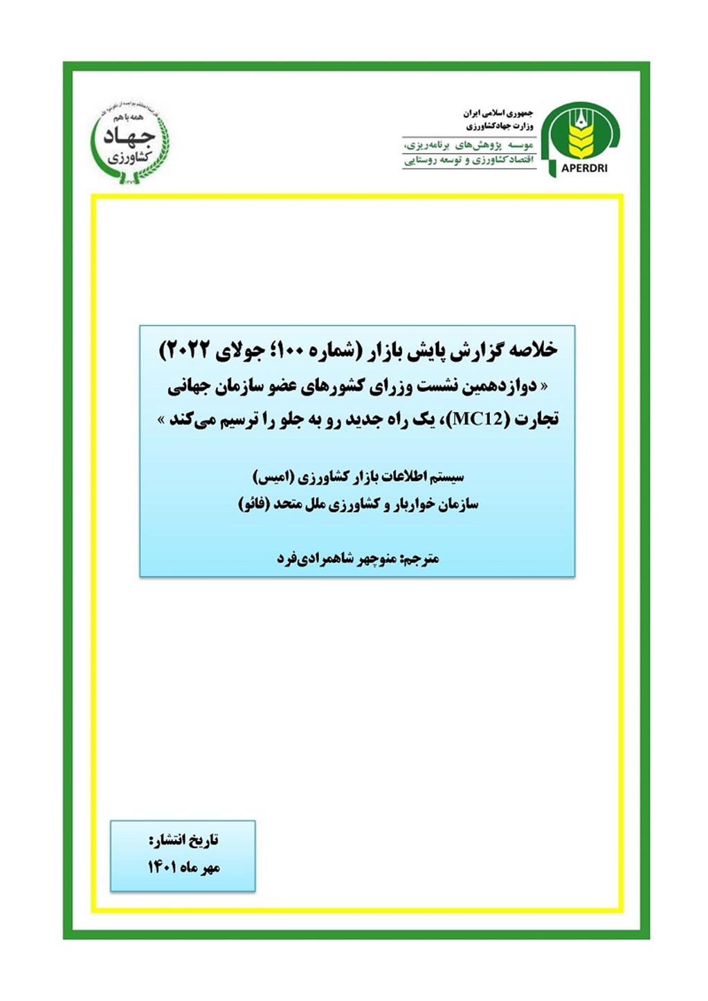خلاصه گزارش پایش بازار(شماره ۱۰۰ ؛ جولای ۲۰۲۲) ؛ سیستم اطلاعات بازار کشاورزی (آمیس)«دوازدهمین نشست وزرای کشورهای عضو سازمان جهانی تجارت ( MC۱۲)، یک راه جدید رو به جلو را ترسیم می کند»