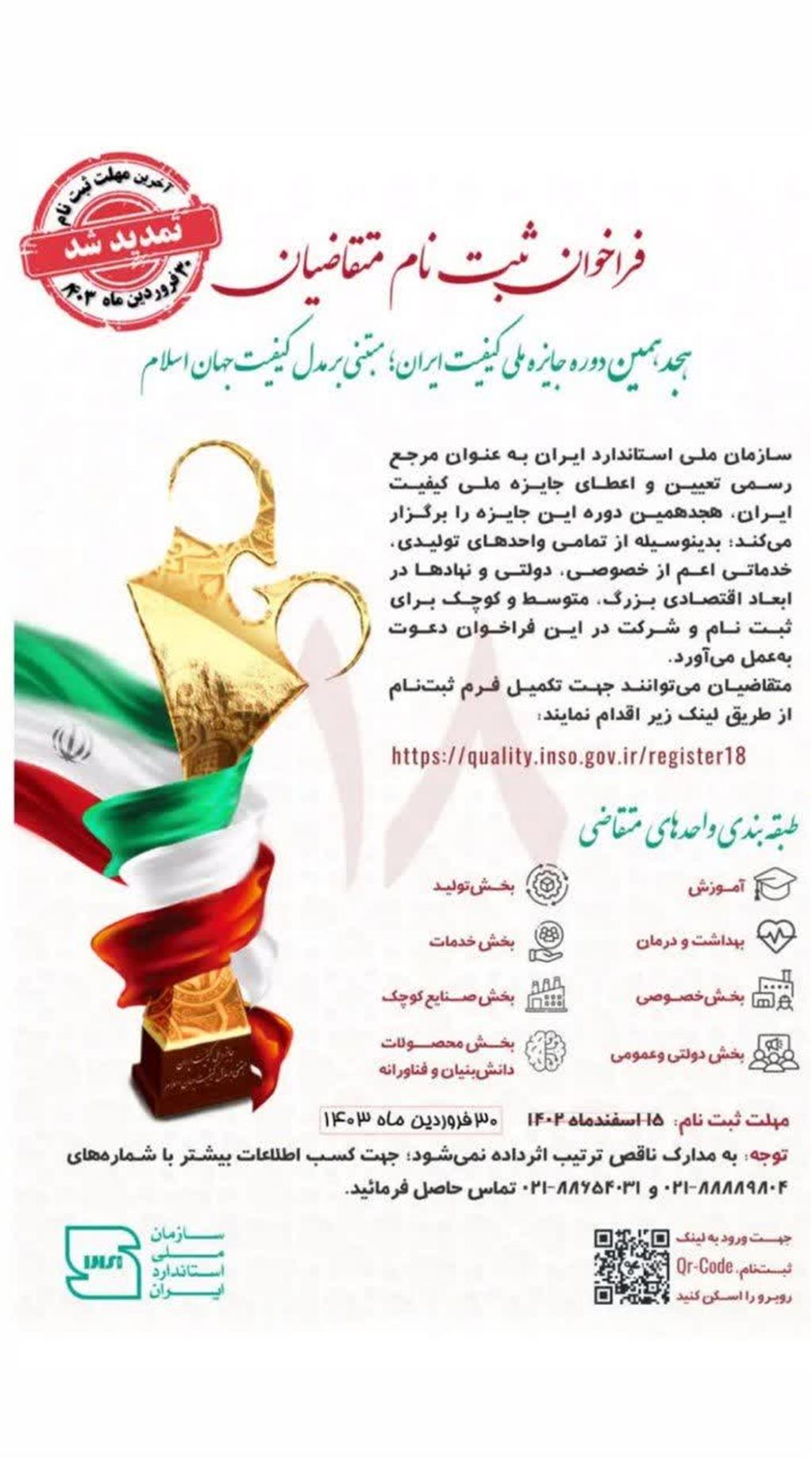 فراخوان ثبت نام متقاضیان هجدهمین دوره جایزه ملی کیفیت ایران مبتنی بر مدل کیفیت جهان اسلام