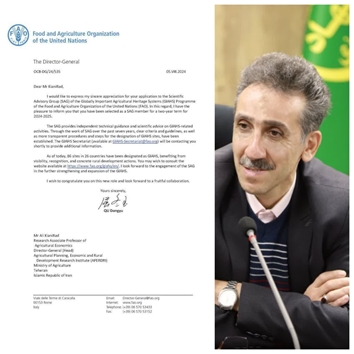 انتصاب علی کیانی راد دانشیار و رئیس موسسه پژوهشهای برنامهریزی، اقتصاد کشاورزی و توسعه روستایی توسط مدیرکل فائو، به عنوان عضو گروه مشاوران علمی (SAG) نظامهای میراثی کشاورزی مهم جهانی (GIAHS) فائو