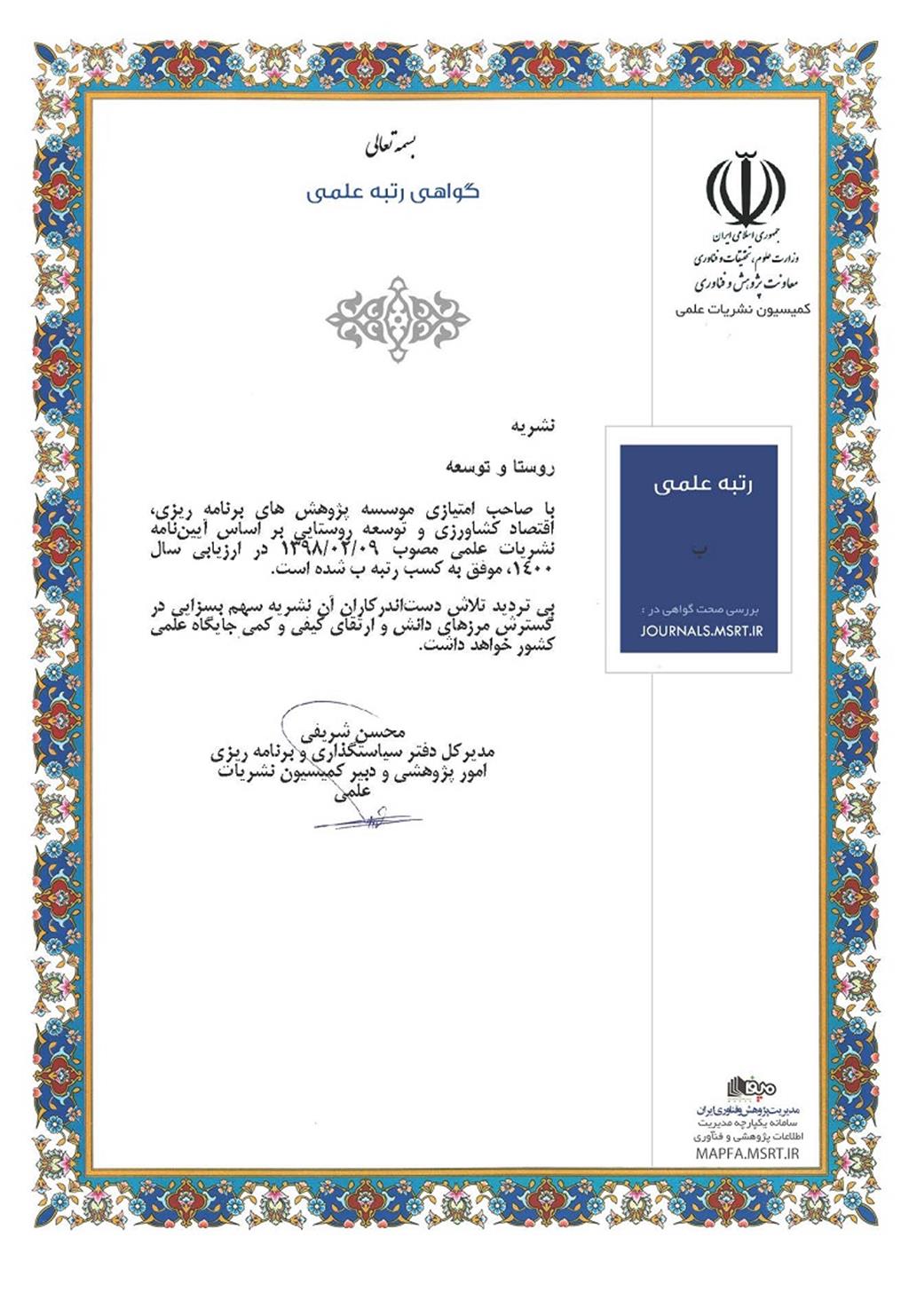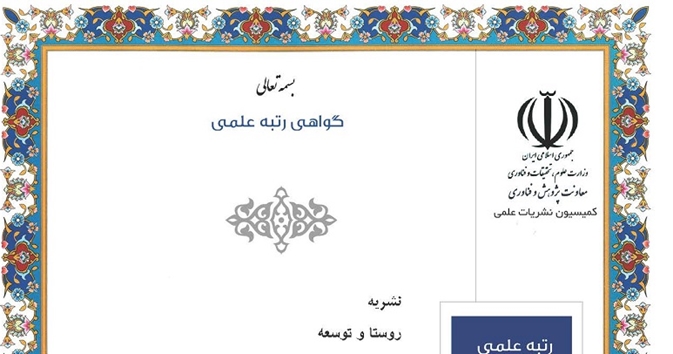 فصلنامه روستا و توسعه در فرآیند ارزیابی و رتبه بندی نشریات علمی کشور توسط کمیسیون علمی وزارت علوم،تحقیقات و فناوری در سال 1400 ، در رتبه "ب" قرار گرفت.