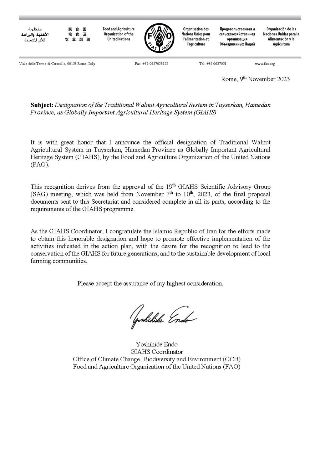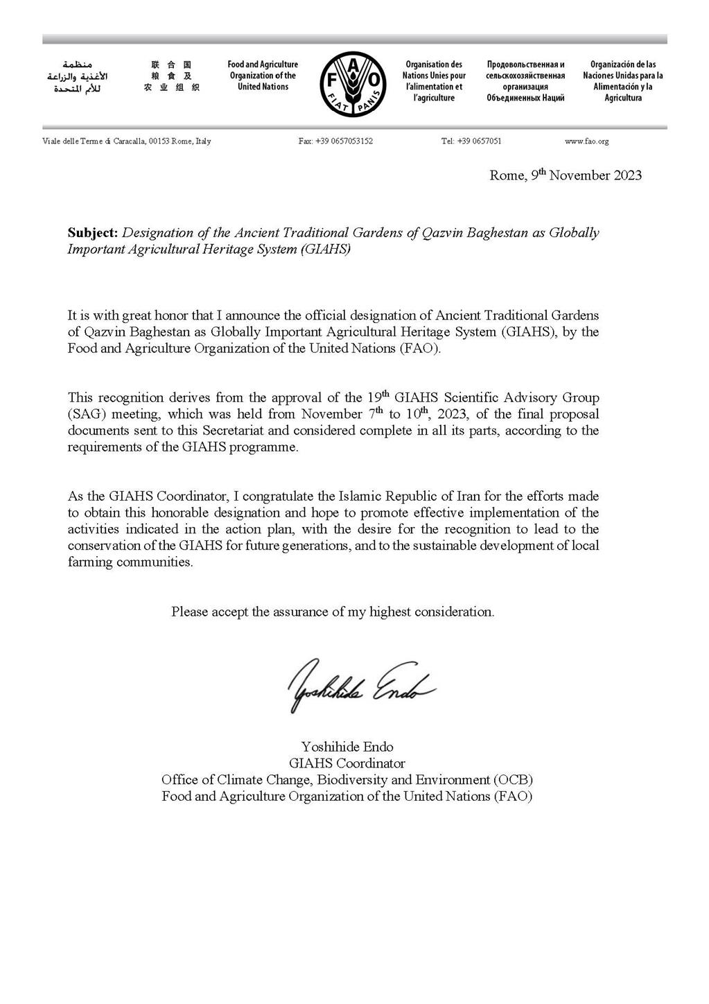 متن تقدیر و تشکر GIAHS از موسسه در خصوص ثبت نظام جیاس باغستان قزوین و نظام کشاورزی گردو سنتی در تویسرکان