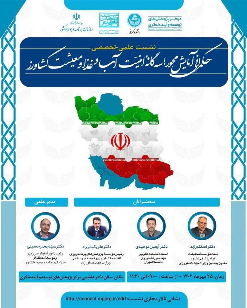 نشست علمی - تخصصی حکمرانی آمایش محور؛ سه گانه امنیت آب و غذا و معیشت کشاورز