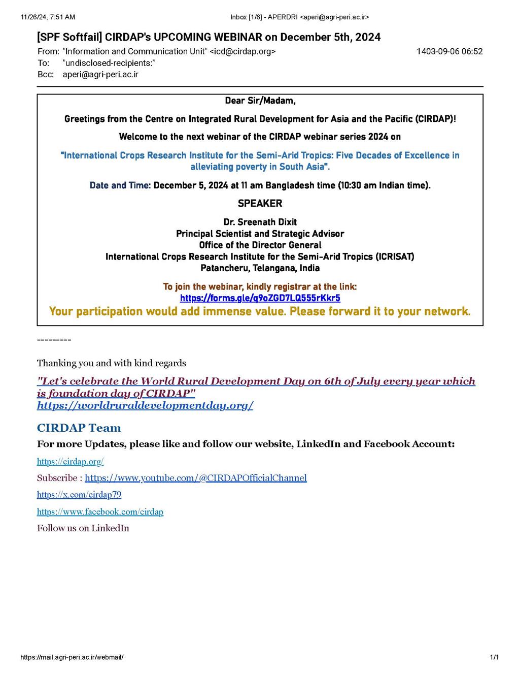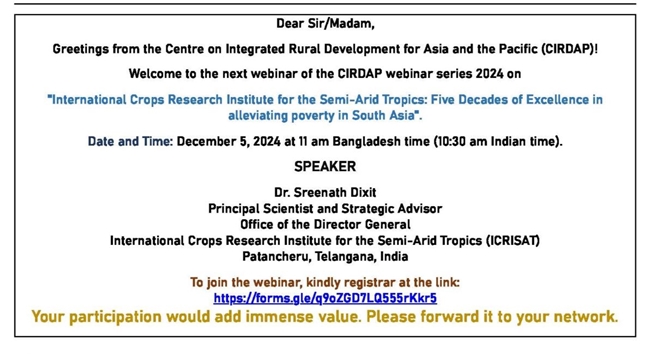 موسسه پژوهش‌های برنامه‌ریزی، اقتصادکشاورزی و توسعه روستایی، موسسه پژوهشی رابط با مرکز توسعه روستایی یکپارچه برای آسیا و اقیانوسیه CIRDAP دعوت به وبینار علمی مجازی تحت عنوان "موسسه تحقیقات بین‌المللی برای مناطق استوایی نیمه خشک: پنج دهه برتری در کاهش فقر" می‌نماید.