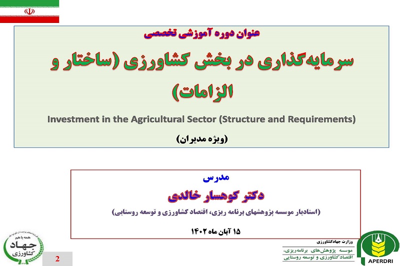 کارگاه آموزشی با عنوان «سرمایه‌گذاری در بخش کشاورزی (ساختار و الزامات)»( ویژه مدیران) با ارائه‌ی جناب آقای دکتر کوهسار خالدی، عضو هیات علمی محترم گروه پژوهشی سیاست­های کشاورزی و غذای موسسه‌ی پژوهش‏های برنامه‏ریزی، اقتصادکشاورزی و توسعه‌ی روستایی در روز دوشنبه 15 آبان 1402، از ساعت 09 الی 12 و با حضور مدیران مرتبط سازمان‌های جهاد کشاورزی استان‌ها به صورت ویدئو کنفرانس توسط واحد آموزش موسسه پزوهش‏ها برگزار شد.