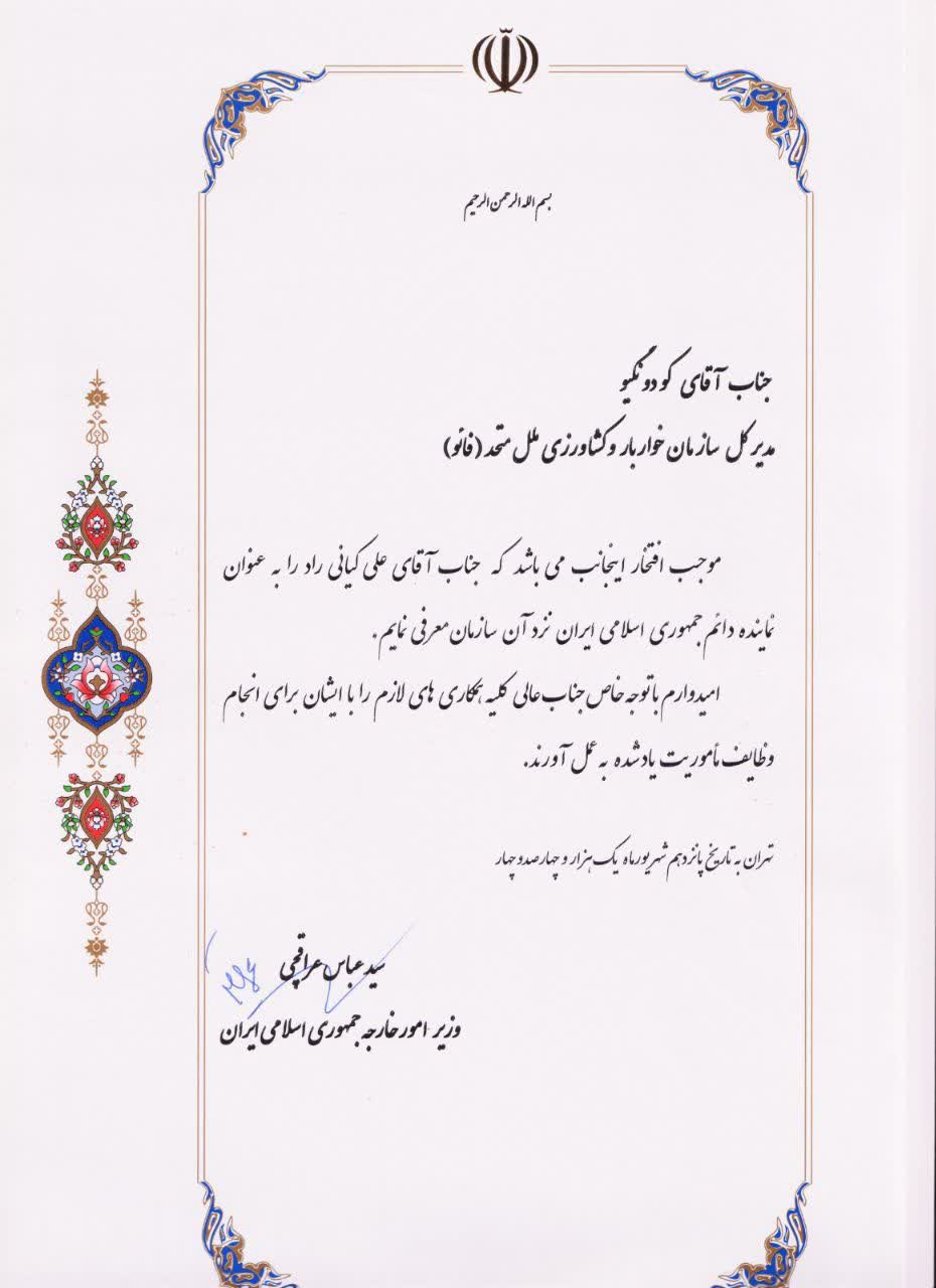 جناب آقای دکتر علی کیانی‌راد سفیر و نماینده دائم ایران نزد سازمان فائو در رم شد.