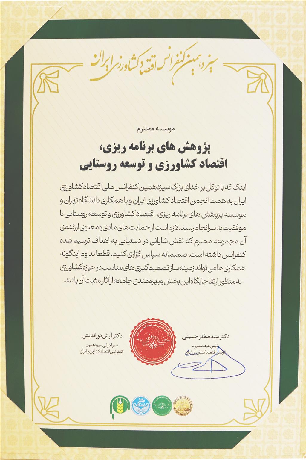 سیزدهمین کنفرانس ملی اقتصادکشاورزی ایران با عنوان "فرصت ها و چالشهای اقتصاد کشاورزی ایران با رویکرد کشاورزی نوین"