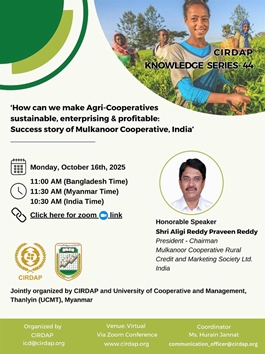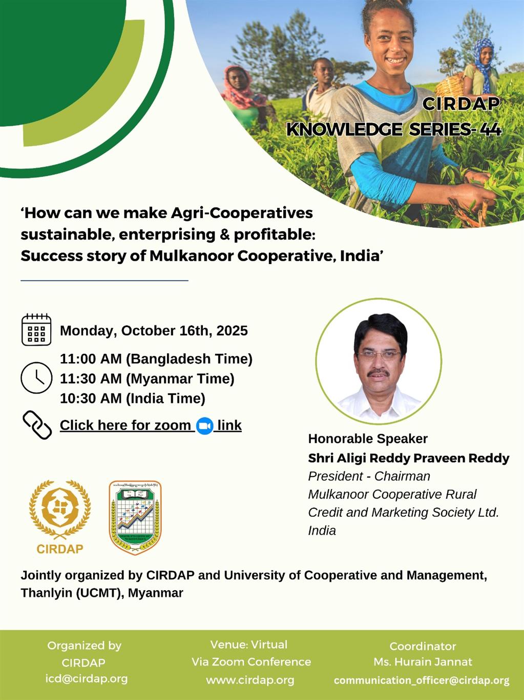 موسسه پژوهش‌های برنامه‌ریزی، اقتصادکشاورزی و توسعه روستایی، موسسه پژوهشی رابط با مرکز توسعه روستایی یکپارچه برای آسیا و اقیانوسیه CIRDAP، با همکاری دانشگاه مدیریت و تعاون تانلین (UCMT) میانمار، دعوت به وبینار علمی مجازی تحت عنوان «چگونه تعاونی‌های کشاورزی را پایدار، کارآفرین و سودآور کنیم: تجربه موفقیت تعاونی ملکانور، هند» می‌نماید.