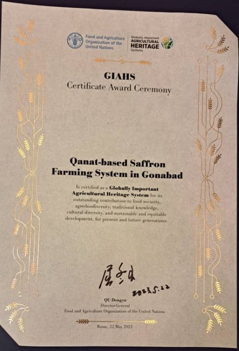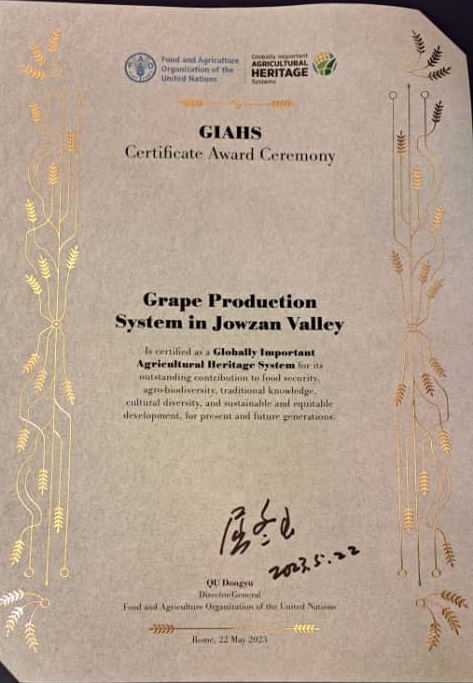 گواهی های ثبت جهانی دونظام میراثی کشاورزی مهم جهانی جمهوری اسلامی ایران توسط مدیرکل فائو اعطا شد.