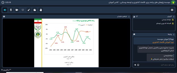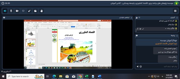 دوره آموزشی با عنوان «اقتصاد کشاورزی »با ارائهی جناب آقای دکتر ابراهیم جاودان عضو هیات علمی محترم گروه پژوهشی سیاستهای کشاورزی و غذا موسسه پژوهشهای برنامه ریزی، اقتصادکشاورزی و توسعه روستایی در روز چهارشنبه 22 اسفند ماه 1403، از ساعت 9:30 الی 12 و با حضور جمعی از مدیران و کارشناسان سازمانهای جهادکشاورزی استانهای کشور به صورت ویدئوکنفرانس (وبینار)، توسط واحد آموزش موسسه پژوهشها برگزار شد.