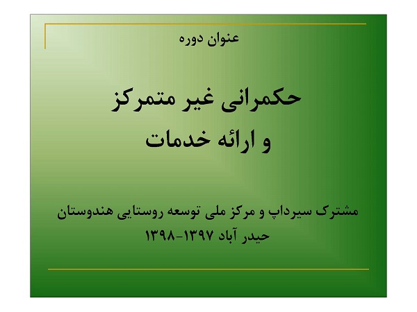 نشست علمی ارائه دستاوردهای حاصل از شرکت در دوره بینالمللی با عنوان « حکمرانی غیر متمرکز و ارائه خدمات - مسیری برای حکمرانی خوب» با ارائه جناب آقای دکتر محسن ابراهیم پور عضو هیات علمی محترم موسسه پژوهشهای برنامهریزی، اقتصادکشاورزی و توسعهروستایی در تاریخ 24 آذر ماه 1399 از ساعت 9 الی 11 و با حضور جمعی از پژوهشگران موسسه و پژوهشگران و کارشناسان دستگاه های مرتبط وزارت جهادکشاورزی و سازمان جهادکشاورزی استانهای مختلف به صورت مجازی در موسسه برگزار شد. این نشست حاصل تجربه شرکت در یک دوره آموزشی با همین عنوان در فروردین سال 1398 بود که بطور مشترک توسط «مرکز توسعه یکپارچه روستایی آسیا و اقیانوسیه (CIRDAP)» و موسسه ملی توسعه روستایی هندوستان به مدت 10 روز در شهر حیدرآباد هندوستان برگزارشد. هدف از برگزاری دوره آشنایی نظری و تجربی با سازوکار حکمرانی غیر متمرکز و ارائه خدمات به مثابه شیوه مناسب حکمرانی میباشد. در این دوره نمایندگانی از کشورهای عضو سیرداپ شامل ایران، هندوستان، اندونزی، بنگلادش، فیلیپین، سریلانکا، ویتنام افغانستان، میانمار و فیجی حضور داشتند.