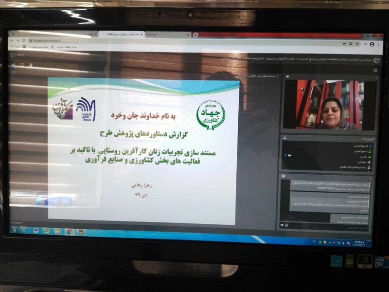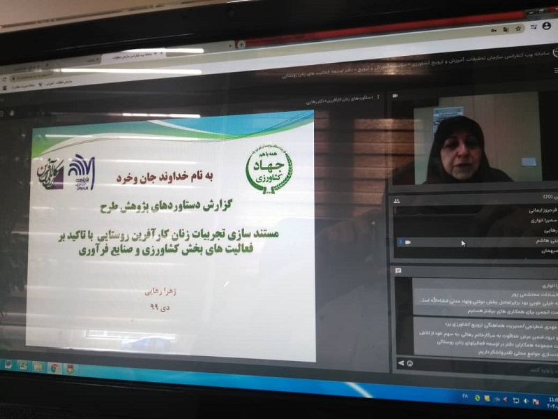 نشست علمی ارائه دستاوردهای حاصل از طرح مطالعاتی «مستند سازی تجربیات زنان کارآفرین روستایی با تاکید بر فعالیت های بخش کشاورزی وصنایع فرآوری با رویکرد دانشی» با ارائه سرکار خانم دکتر زهرا رهایی عضو محترم انجمن ملی زنان کارآفرین(مجری طرح) در تاریخ 2 دی ماه 1399 از ساعت 9 الی 11 و با حضور جمعی از پژوهشگران موسسه و پژوهشگران و کارشناسان دستگاه های مرتبط وزارت جهادکشاورزی و سازمان جهادکشاورزی استانهای مختلف به صورت مجازی برگزار شد.
