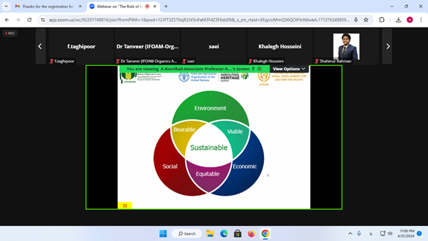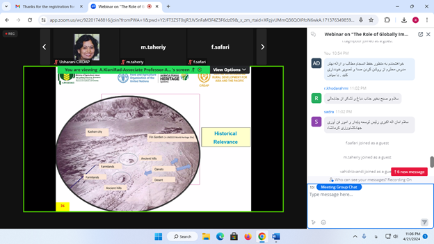 در این نشست علمی که به صورت مجازی به میزبانی دبیرخانه مرکز بینالمللی سیرداپ برگزار شده بود، جناب آقای دکتر کیانی راد ضمن معرفی نظامهای میراثی کشاورزی با اهمیت جهانی(GIAHS) و فرآیند و اهداف آن، با بیان جایگاه جمهوری اسلامی ایران بعنوان چهارمین کشور دنیا از لحاظ تعداد نظامهای ثبت شده در جیاس، بر تاثیر شناسایی، ثبت و حفاظت و حمایت از این نظام های میراثی کشاورزی مهم جهانی بر توسعه پایدار کشاورزی روستا پایه، و توسعه گردشگری پایدار کشاورزی، روستایی و غذایی تاکید کردند.