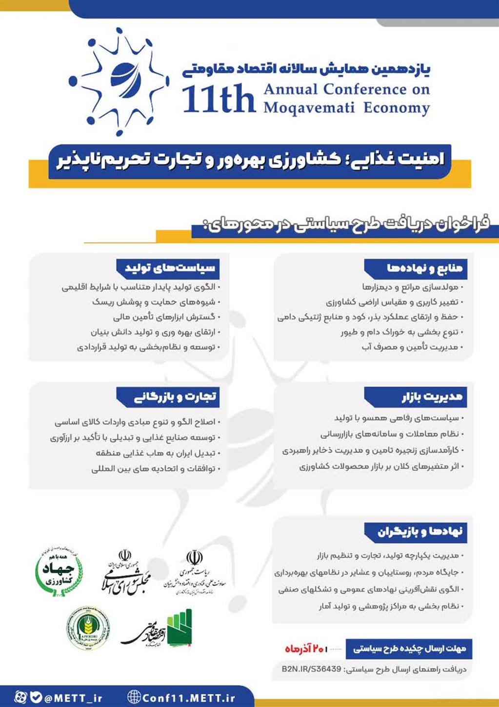 یازدهمین همایش سالانه اقتصاد مقاومتی با موضوع «امنیت غذایی؛ کشاورزی بهرهور و تجارت تحریمناپذیر» در حال برگزاری است. با توجه به رویکرد سیاستی و عملیاتی همایش، مشارکت در این رویداد به جای مقالات مرسوم، با ارائه «طرح سیاستی» انجام میشود.