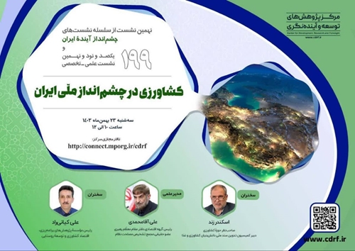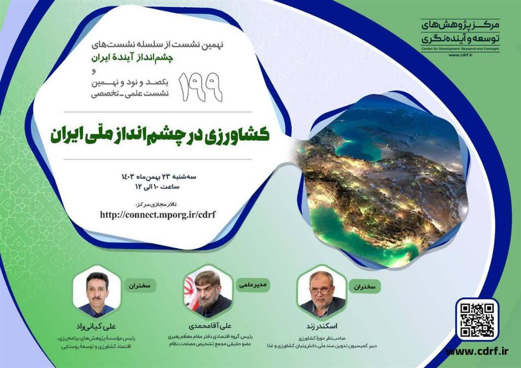 نهمین نشست از سلسله نشست‌های «چشم انداز آینده ایران» و یک صد و نود و نهمین نشست مرکز پژوهشهای توسعه و آینده‌نگری تحت عنوان «کشاورزی در چشم انداز ملّی ایران» برگزار می‌شود.